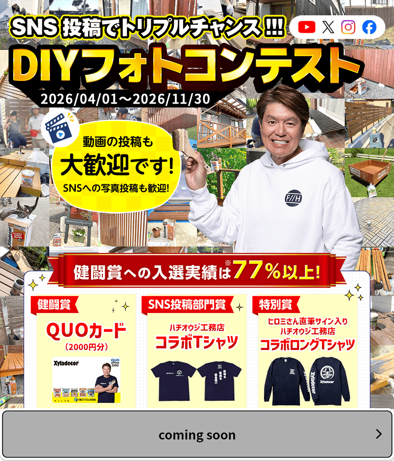 塗るだけじゃ物足らん!組み立てや釘打ちまで自分でやっちゃえば、もっと楽しくてカッコいいオリジナル作品が完成します。自分の手で作り上げるワクワク感は最高だし、細かいところまでこだわれるから、世界にひとつだけのアイテムができちゃいますよ。さあ、塗るだけじゃなくて、組み立てや釘打ちにもチャレンジして、DIYの楽しさをフルで味わおう!あなたの手で作る作品が、毎日をもっとハッピーにしてくれます! 室外機カバー 宅配ボックス 傘立て リラックスチェア 棚 犬小屋 ヒロミさん流のキシラデコールの塗り方が解ります! キシラデコールで塗装したらフォトコンテストへ応募!
