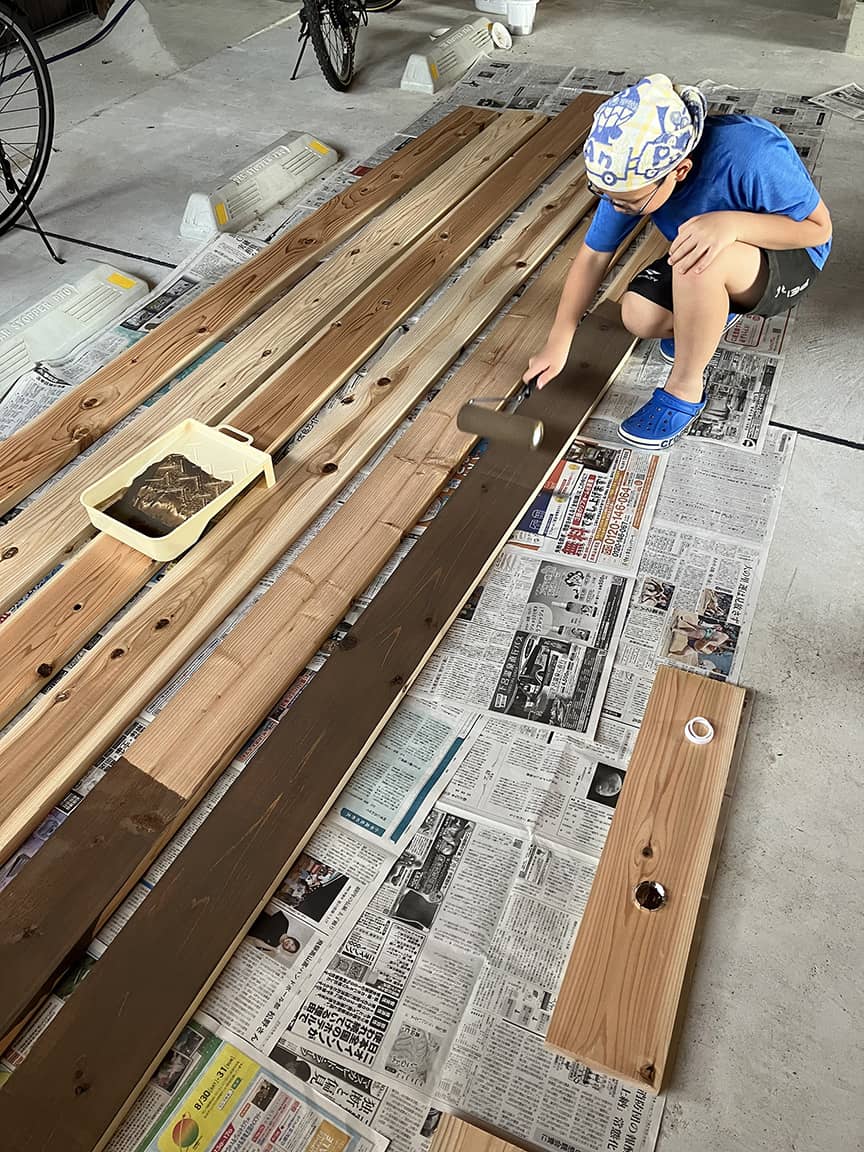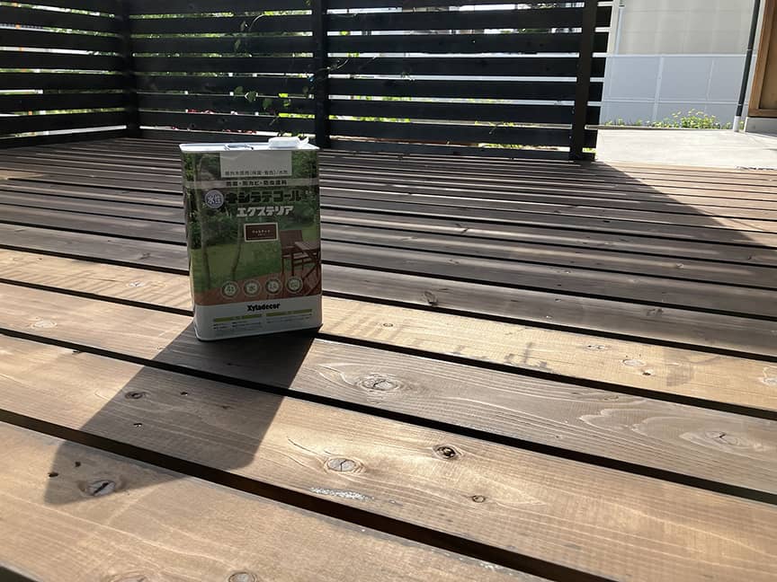 DIY事例集TOPへ 条件を指定して検索 カラー検索 全て クリア系 白系 黄色系 オレンジ系 明るい茶系 濃い茶系 黒系 緑系 グレー系 赤系 青系 下塗り用 カラー検索でどの系統の色にどの製品のどの色目が含まれているのかを以下のリンクでご確認いただけます。 制作物の種類 全て ウッドデッキ 外壁・ウッドフェンス テーブル・ベンチ 花台・小物 小屋・物置・その他 キーワード検索 検索する ホーム>DIY事例集トップ>水性キシラデコールエクステリア ウッドデッキ コメントウッドデッキが腐り危険な状態だったので、DIYに挑戦することにした。ちょうど小学5年生の次男が夏休みに入り、自由工作に悩んでいたため、一緒に補修を行うことにした。作業の報告書をQRコード付きでまとめ、学校へ提出する予定。 製品名水性キシラデコールエクステリア カラーウォルナット キシラデコール 50年以上の実績が語るプロが認めた仕上がりと耐久性 発売以来50年以上の実績を持つ木材保護塗料の定番ブランド。多くの採用実績が高い防腐・防カビ・防虫効果を証明しています。 キシラデコールアクオステージ高い着色力によりさらなる耐久性を実現! 耐候性に優れた顔料を高濃度に配合し、「高着色」と「高耐久」を実現。メンテナンスにも最適です。 キシラデコールフォレステージHSキシラデコールフォレステージの顔料を高濃度に配合! キシラデコールフォレステージの性能はそのままに、高着色の新商品。耐候性も高く、塗り替えに適しています。 キシラデコールフォレステージキシラデコールの性能をそのままに乾燥時間の短縮と低臭性を実現 新処方により、優れた「乾燥性」と「低臭性」を実現した新しいタイプの木材保護塗料です。 キシラデコールやすらぎ ナチュラルで透明感のある仕上り 木の色や質感、木目の美しさをそのまま生かした、透明感のある仕上がりを実現しました。 キシラデコールコンゾラン よみがえる「強さ」と「美しさ」 塗膜の質を徹底的に追及しました。「強さ」と「美しさ」を兼ね備えた塗料です。 キシラデコールインテリアファイン 内外揃うキシラデコールカラー キシラデコールインテリアファイントップコート 木目を活かしたクリアー仕上げ キシラデコールインテリアファインを美しく保護するトップコートです。 キシラデコール白木やすらぎ 白木の美しい風合いを生かしながら変色・劣化から守る キシラデコールの性能にUV(紫外線)カット効果をプラス。白木の風合いを生かしながら木部の劣化・変色を防ぎます。 水性キシラデコールエクステリア 環境にやさしい水性タイプのキシラデコール 水性キシラデコールエクステリアは、油性キシラデコールと同レベルの耐久性をもちつつも、より環境にやさしく、使いやすい商品です。水性キシラデコールエクステリアで、エコで快適な塗装を。 水性キシラデコールウッドコート 特殊な塗膜(半造膜)で明るく仕上がり高耐久! 塗膜の3大特長(柔軟性・通気性・密着性)により、業界最高クラスの耐久性を発揮します。 また、色つきが良く、古材や濃い色の木材でも明るく仕上げることができ、塗り替えに最適です。 コンゾラン 抜群の耐久性で木部を守る、環境にやさしい水性ペイント 鮮やかなヨーロピアンカラーがラインアップ。柔軟な塗膜で木材を守ります。