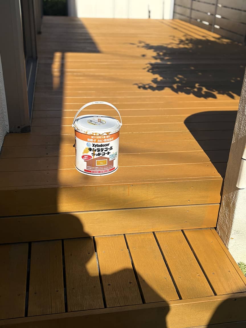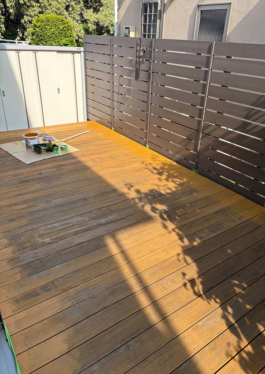 DIY事例集TOPへ 条件を指定して検索 カラー検索 全て クリア系 白系 黄色系 オレンジ系 明るい茶系 濃い茶系 黒系 緑系 グレー系 赤系 青系 下塗り用 カラー検索でどの系統の色にどの製品のどの色目が含まれているのかを以下のリンクでご確認いただけます。 制作物の種類 全て ウッドデッキ 外壁・ウッドフェンス テーブル・ベンチ 花台・小物 小屋・物置・その他 キーワード検索 検索する ホーム>DIY事例集トップ>水性キシラデコールウッドコート ウッドデッキ コメント家のウッドデッキが綺麗になるのが気持ち良く楽しくてしょうがないです。数年に一度、ウッドデッキの塗装をしています。いろんな塗料を試しましたが、やはり、色合いや塗料が長持ちするキシラデコールに落ち着きました。 塗装は私の役目でウッドデッキがある限りキシラデコールでの塗装をやり続けたいと思います。 製品名水性キシラデコールウッドコート カラーピニー キシラデコール 50年以上の実績が語るプロが認めた仕上がりと耐久性 発売以来50年以上の実績を持つ木材保護塗料の定番ブランド。多くの採用実績が高い防腐・防カビ・防虫効果を証明しています。 キシラデコールアクオステージ高い着色力によりさらなる耐久性を実現! 耐候性に優れた顔料を高濃度に配合し、「高着色」と「高耐久」を実現。メンテナンスにも最適です。 キシラデコールフォレステージHSキシラデコールフォレステージの顔料を高濃度に配合! キシラデコールフォレステージの性能はそのままに、高着色の新商品。耐候性も高く、塗り替えに適しています。 キシラデコールフォレステージキシラデコールの性能をそのままに乾燥時間の短縮と低臭性を実現 新処方により、優れた「乾燥性」と「低臭性」を実現した新しいタイプの木材保護塗料です。 キシラデコールやすらぎ ナチュラルで透明感のある仕上り 木の色や質感、木目の美しさをそのまま生かした、透明感のある仕上がりを実現しました。 キシラデコールコンゾラン よみがえる「強さ」と「美しさ」 塗膜の質を徹底的に追及しました。「強さ」と「美しさ」を兼ね備えた塗料です。 キシラデコールインテリアファイン 内外揃うキシラデコールカラー キシラデコールインテリアファイントップコート 木目を活かしたクリアー仕上げ キシラデコールインテリアファインを美しく保護するトップコートです。 キシラデコール白木やすらぎ 白木の美しい風合いを生かしながら変色・劣化から守る キシラデコールの性能にUV(紫外線)カット効果をプラス。白木の風合いを生かしながら木部の劣化・変色を防ぎます。 水性キシラデコールエクステリア 環境にやさしい水性タイプのキシラデコール 水性キシラデコールエクステリアは、油性キシラデコールと同レベルの耐久性をもちつつも、より環境にやさしく、使いやすい商品です。水性キシラデコールエクステリアで、エコで快適な塗装を。 水性キシラデコールウッドコート 特殊な塗膜(半造膜)で明るく仕上がり高耐久! 塗膜の3大特長(柔軟性・通気性・密着性)により、業界最高クラスの耐久性を発揮します。 また、色つきが良く、古材や濃い色の木材でも明るく仕上げることができ、塗り替えに最適です。 コンゾラン 抜群の耐久性で木部を守る、環境にやさしい水性ペイント 鮮やかなヨーロピアンカラーがラインアップ。柔軟な塗膜で木材を守ります。