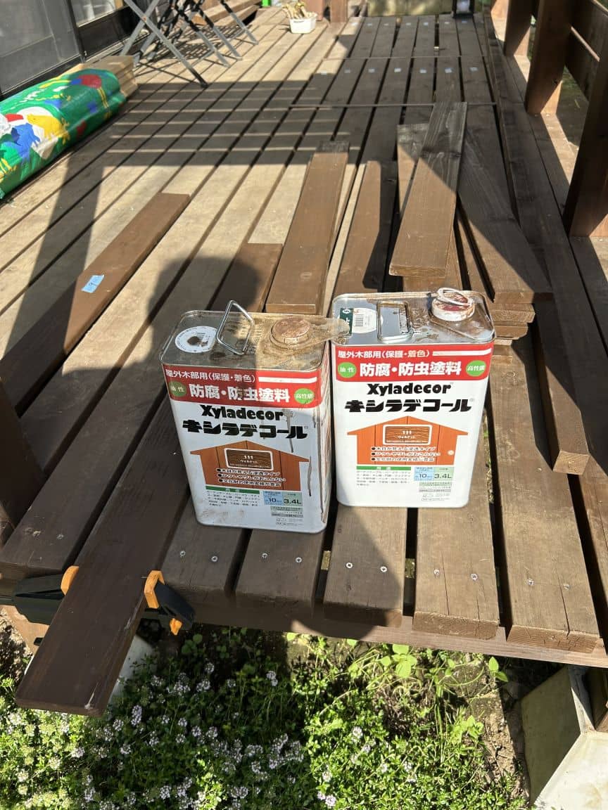 DIY事例集TOPへ 条件を指定して検索 カラー検索 全て クリア系 白系 黄色系 オレンジ系 明るい茶系 濃い茶系 黒系 緑系 グレー系 赤系 青系 下塗り用 カラー検索でどの系統の色にどの製品のどの色目が含まれているのかを以下のリンクでご確認いただけます。 制作物の種類 全て ウッドデッキ 外壁・ウッドフェンス テーブル・ベンチ 花台・小物 小屋・物置・その他 キーワード検索 検索する ホーム>DIY事例集トップ>油性キシラデコール ウッドデッキ コメント孫誕生に合わせてウッドデッキ作り替えを開始、4畳半の大きさにプライベート感を重視してフェンスも造作、ガーデンシンク、足湯も作って更にライトアップ、昼間も夜も大活躍です。 苦節7ヶ月コツコツ仕上げました。 製品名油性キシラデコール カラーウォルナット キシラデコール 50年以上の実績が語るプロが認めた仕上がりと耐久性 発売以来50年以上の実績を持つ木材保護塗料の定番ブランド。多くの採用実績が高い防腐・防カビ・防虫効果を証明しています。 キシラデコールアクオステージ高い着色力によりさらなる耐久性を実現! 耐候性に優れた顔料を高濃度に配合し、「高着色」と「高耐久」を実現。メンテナンスにも最適です。 キシラデコールフォレステージHSキシラデコールフォレステージの顔料を高濃度に配合! キシラデコールフォレステージの性能はそのままに、高着色の新商品。耐候性も高く、塗り替えに適しています。 キシラデコールフォレステージキシラデコールの性能をそのままに乾燥時間の短縮と低臭性を実現 新処方により、優れた「乾燥性」と「低臭性」を実現した新しいタイプの木材保護塗料です。 キシラデコールやすらぎ ナチュラルで透明感のある仕上り 木の色や質感、木目の美しさをそのまま生かした、透明感のある仕上がりを実現しました。 キシラデコールコンゾラン よみがえる「強さ」と「美しさ」 塗膜の質を徹底的に追及しました。「強さ」と「美しさ」を兼ね備えた塗料です。 キシラデコールインテリアファイン 内外揃うキシラデコールカラー キシラデコールインテリアファイントップコート 木目を活かしたクリアー仕上げ キシラデコールインテリアファインを美しく保護するトップコートです。 キシラデコール白木やすらぎ 白木の美しい風合いを生かしながら変色・劣化から守る キシラデコールの性能にUV(紫外線)カット効果をプラス。白木の風合いを生かしながら木部の劣化・変色を防ぎます。 水性キシラデコールエクステリア 環境にやさしい水性タイプのキシラデコール 水性キシラデコールエクステリアは、油性キシラデコールと同レベルの耐久性をもちつつも、より環境にやさしく、使いやすい商品です。水性キシラデコールエクステリアで、エコで快適な塗装を。 水性キシラデコールウッドコート 特殊な塗膜(半造膜)で明るく仕上がり高耐久! 塗膜の3大特長(柔軟性・通気性・密着性)により、業界最高クラスの耐久性を発揮します。 また、色つきが良く、古材や濃い色の木材でも明るく仕上げることができ、塗り替えに最適です。 コンゾラン 抜群の耐久性で木部を守る、環境にやさしい水性ペイント 鮮やかなヨーロピアンカラーがラインアップ。柔軟な塗膜で木材を守ります。